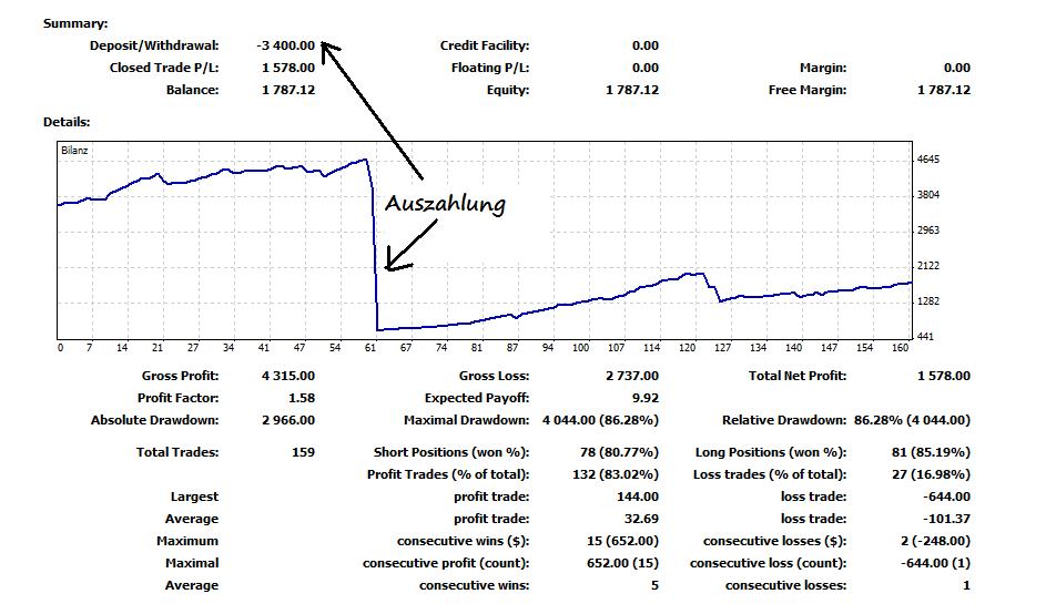 Gast Wehrbär Beitrag melden Mai 26, 2010 geantwortet (bearbeitet) Und trotzdem rennen Tradingprogramme die 20-30% Gewinn am Tag(!!) ertraden, geschrieben von 17jährigen. Und Banken wie Goldman Sucks weisen ein Quartal ohne einen einzigen Tag Verlust im Trading auf.Was sind das für Programme und wie funktionieren sie? Ich kann mir aus Prinzip nicht vorstellen, dass es möglich sein soll, den Markt dauerhaft zu schlagen. Die Börse ist ja ein vielfach rückgekoppeltes, komplexes System, also quasi per definition nicht deterministisch. Jeder dauerhafte Erfolg kann demnach eigentlich nur auf reinem Zufall beruhen, wäre es anders, könnte die Börse nicht funktionieren.Du erwartest jetzt nicht, daß ich Dir das Geheimrezept von Coca-Cola rausrücke? Und ich hab generell ein Problem damit, wenn etwas "aus Prinzip" nicht möglich sein soll.ad Link Goldman Sachsad Tradingprogramm:Wie der das im Detail macht? Keine Ahnung, ist ein Mathegenie. Ich sitz immer nur bei einer Flasche Schampus daneben und grins mir einen wenn ich dort bin. Ich hab hier nur einen Kontoauszug aus einer Pre-Alphaversion eines FOREX-Programms vom letzten Jahr am Rechner, die noch "richtig schlecht" war.Die erste Optimierung gabs nach der Auszahlung bei Trade Nr. 60. Danach hat sich das Kapital in 100 Trades (~2,5 Wochen) vervierfacht, und das trotz eines zwischenzeitlichen Einbruchs um gut 40% (da hat er programmiertechnisch mal kurz ins Klo gegriffen). Inzw. liegt das Ding im Schnitt bei 95% Shortgewinnen und 93% Longgewinnen, also knapp über Zufall. Entsprechend stimme ich Dir vollkommen zu. "Die Börse" funktioniert schon länger nicht mehr (effizient). Mai 26, 2010 bearbeitet von Wehrbär Diesen Beitrag teilen Link zum Beitrag Auf anderen Seiten teilen